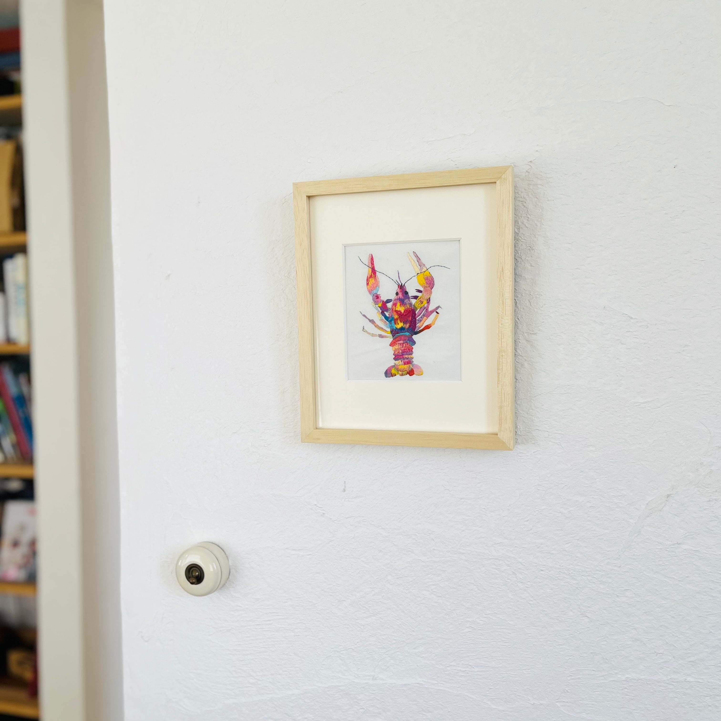 カラフルな糸で丁寧に刺繍した、ザリガニの作品です。